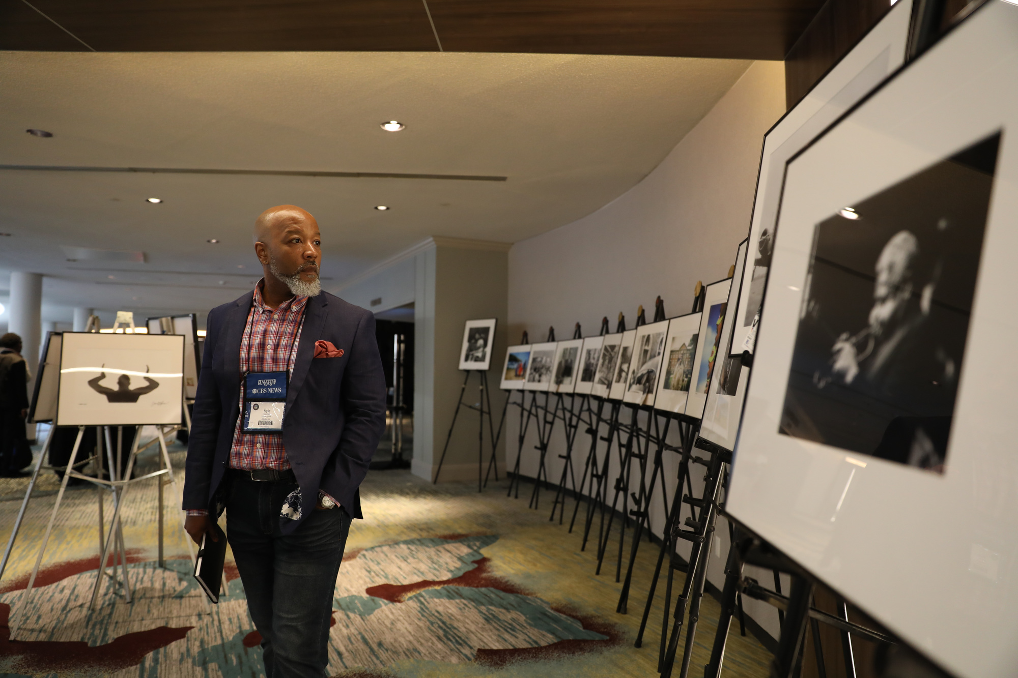 Kyle Wells of Turner Sports in Atlanta, browses the framed photographs to be auctioned at the Mackinac Ballroom in the Detroit Marriott Hotel during the NABJ convention on Saturday, August 4, 2018.