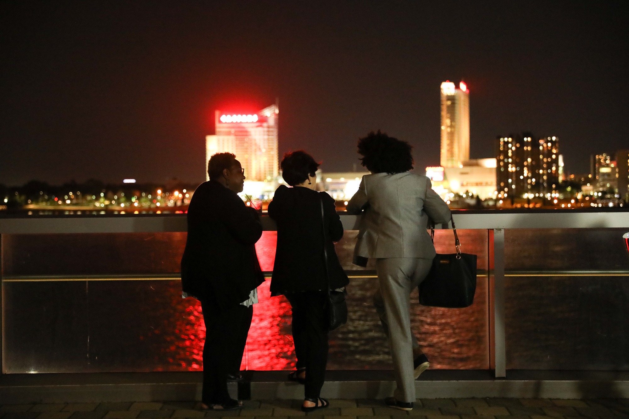 Guests at the President’s Reception in honor of NABJ President, Sarah Glover, look out over the Detroit River towards Windsor, Canada, at the Detroit Marriott, August 2, 2018.