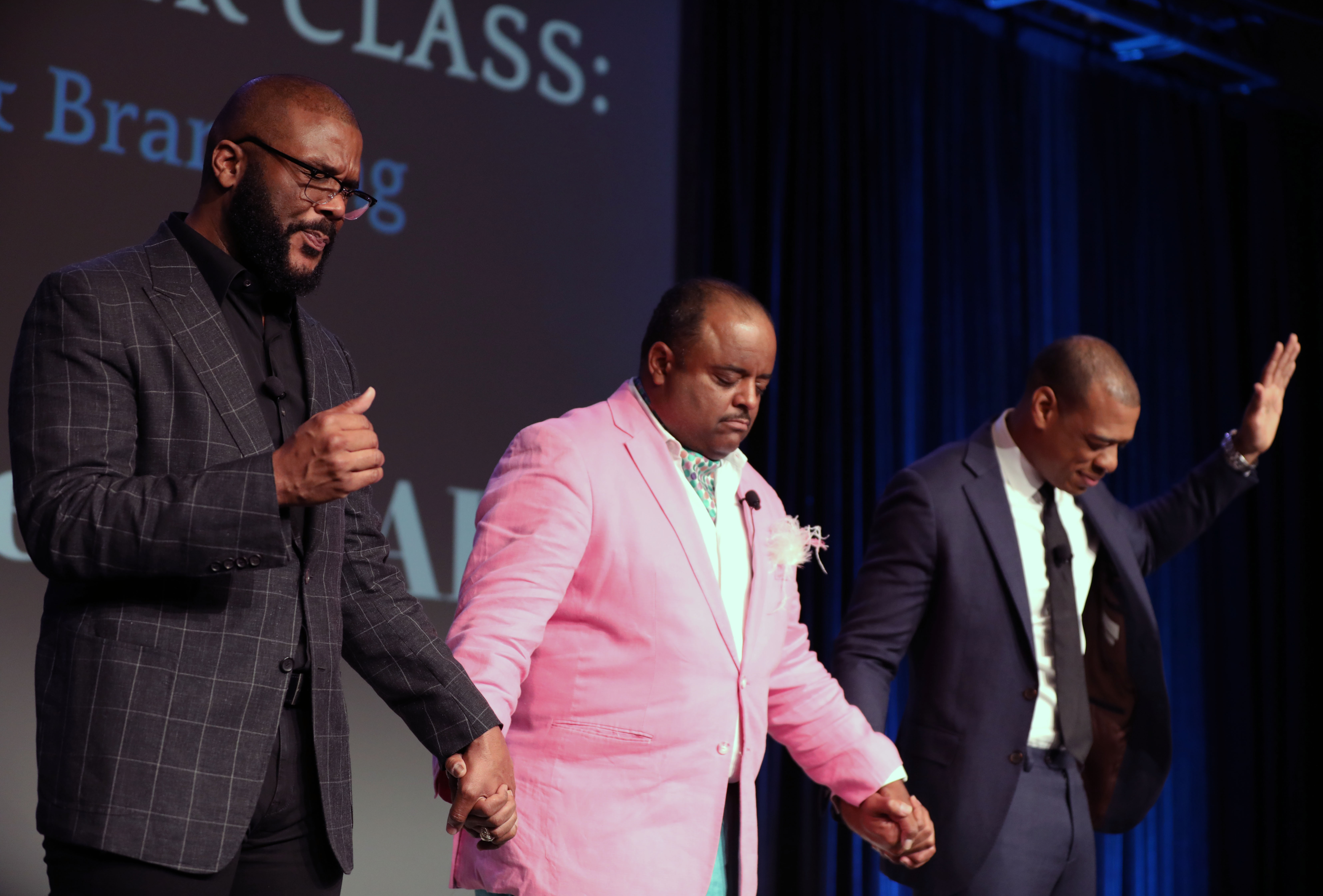 Tyler Perry leads a prayer at the end of his “Entrepreneurship and Branding” Master Class with Roland Martin and DeMarco Morgan at the 2018 NABJ Convention on Friday, August 3 in Detroit, MI. Photo by Jazmin Goodwin.