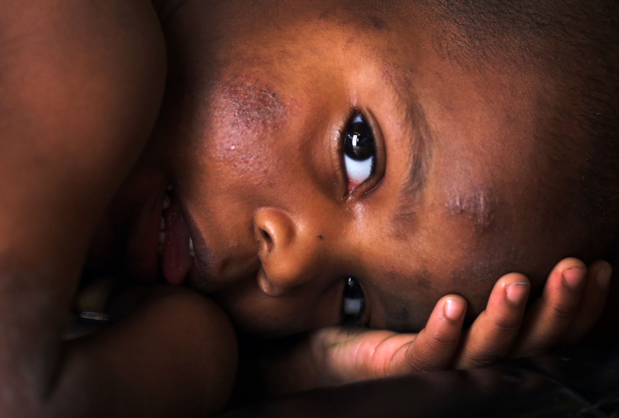 Sincere Smith, 2, of Flint is one of three children living with his single mom Ariana Hawk, 25. He is suffering from severe skin rash issues his mother believes are due to bathing in the contaminated Flint water. His mom no longer bathes him in the tap water. He is on medication to help with this extreme eczema. His skin is raised, itchy and even a bit painful. He is constantly uncomfortable. The discomfort causes his entire family to stress when he is stressed. The sight of water often causes the 2-year-old to break down or retreat to himself. His mom now bathes him with bottled water. Not only is this inconvenient , it is quite costly. She says she is spending at least $27.00 a week on just water for her family. She cannot afford to have bills likes this. He is photographed at his Flint home Wednesday, Jan. 13, 2016. REGINA H. BOONE/ Detroit Free Press