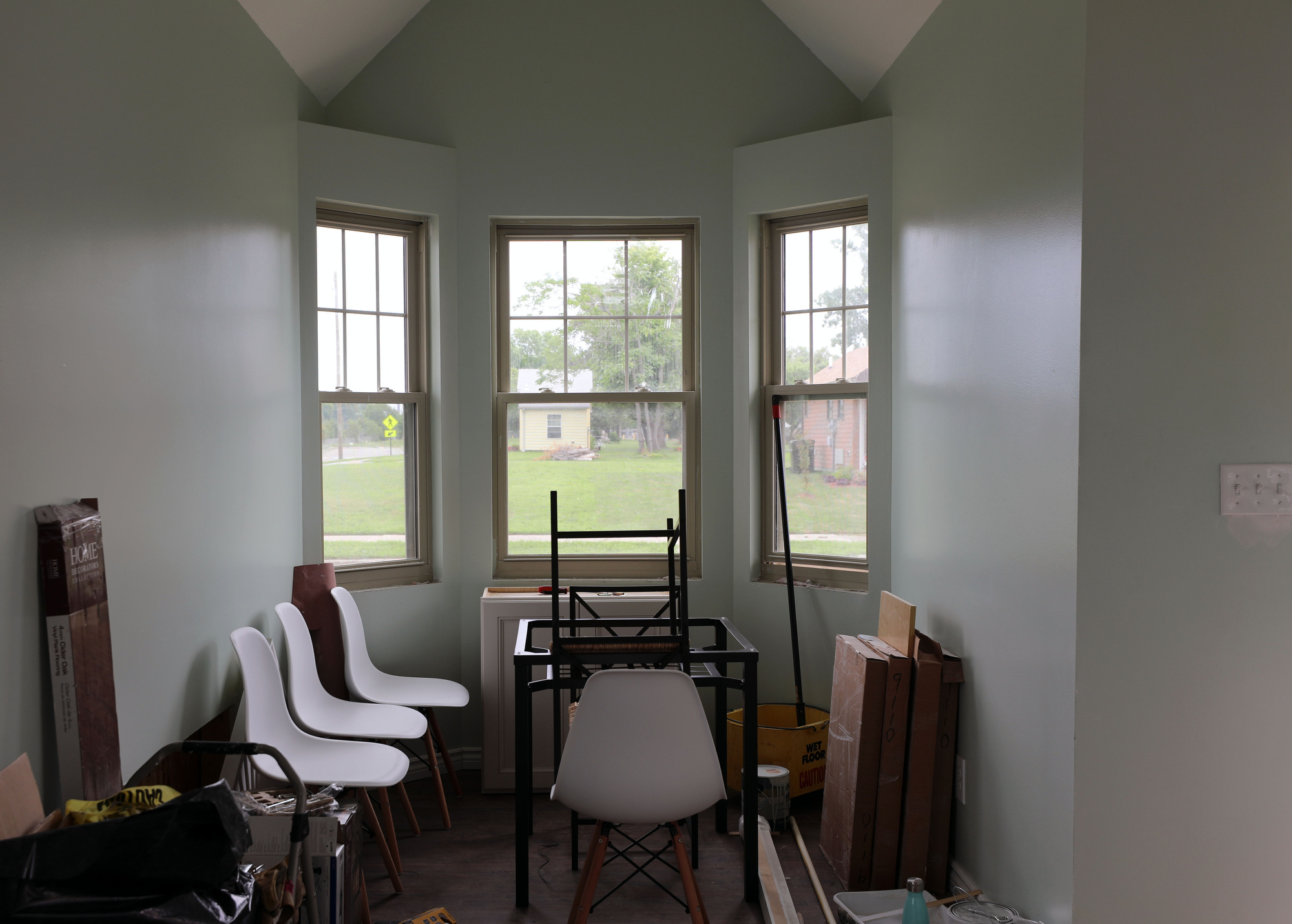 Bay windows provide light and shape to the living room of a tiny home. The homes, being built to provide housing for low-income people, are 250 to 400 square feet.